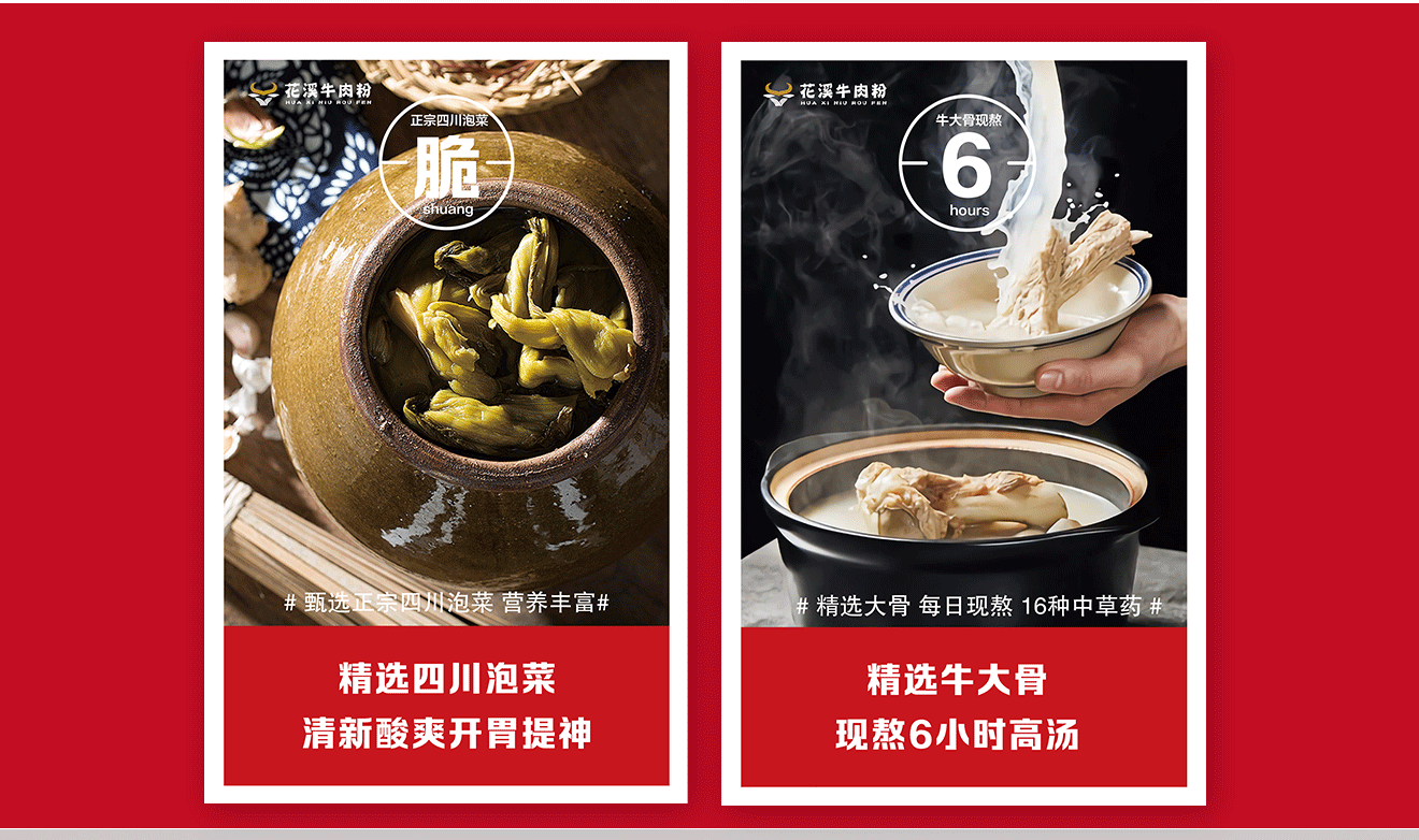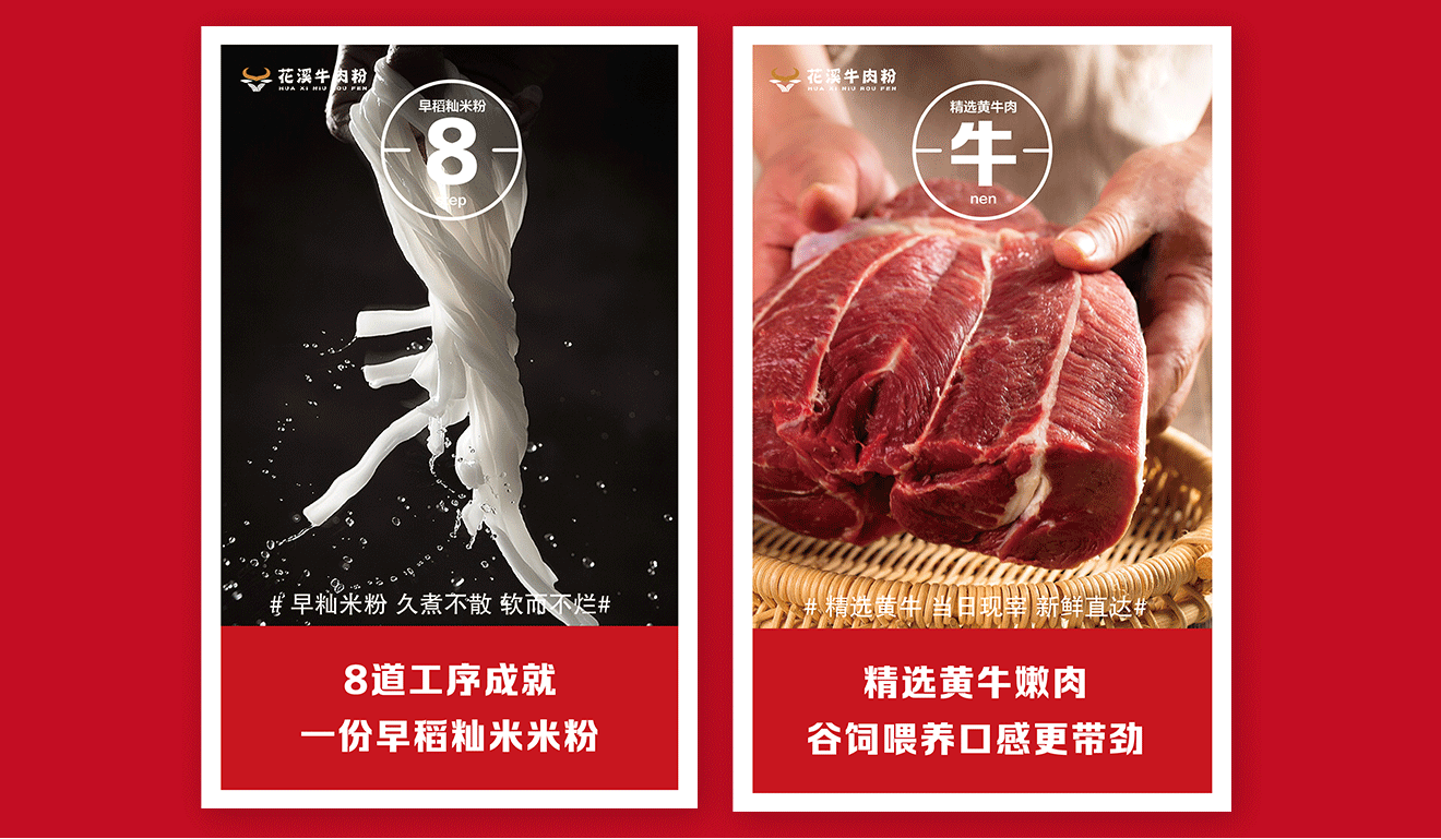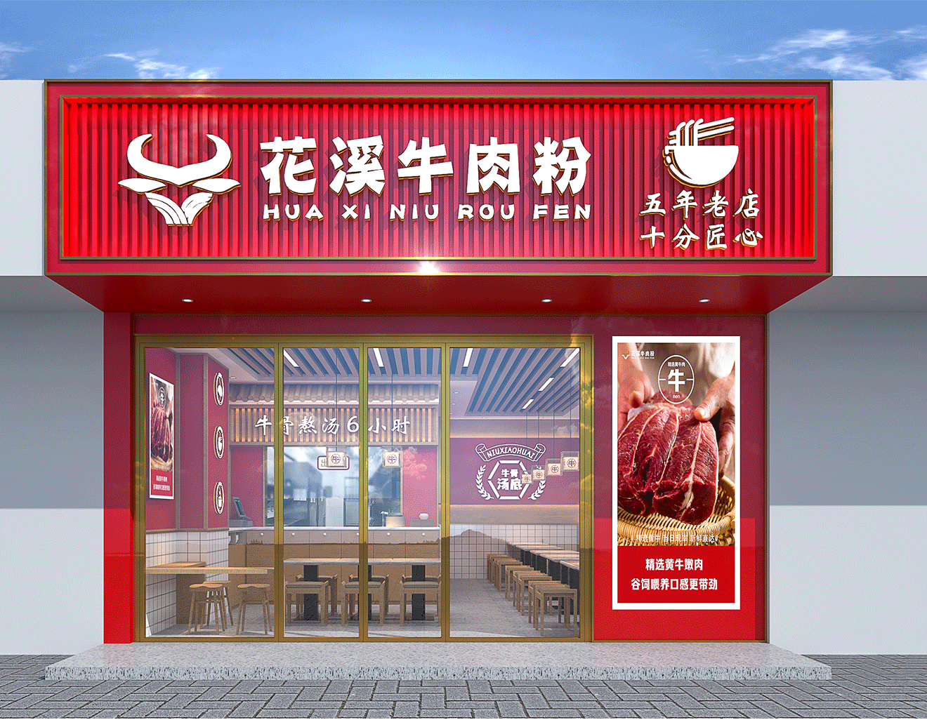 菜品展示可以使用软膜灯箱,软膜灯箱可以展示出美食的色彩和细节,增强视觉效果,让顾客一眼就能被吸引。灯箱可以设计成牛肉粉和其他传统美食的形象,让顾客可以更直观的感受到店铺的特色。